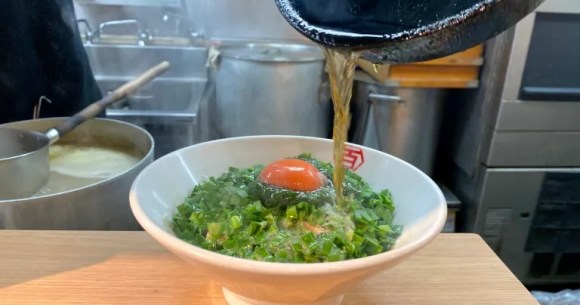 దాషి స్టాక్ లేదు మరియు గిన్నె దిగువన సోయా సాస్ జోడించబడింది, అయితే రుచి చివ్స్ యొక్క సువాసన మరియు క్రంచీ ఆకృతితో వ్యాపిస్తుంది. స్పష్టంగా వారు ప్రతి కుండ కోసం మొత్తం చివ్‌ను ఉపయోగిస్తారు.