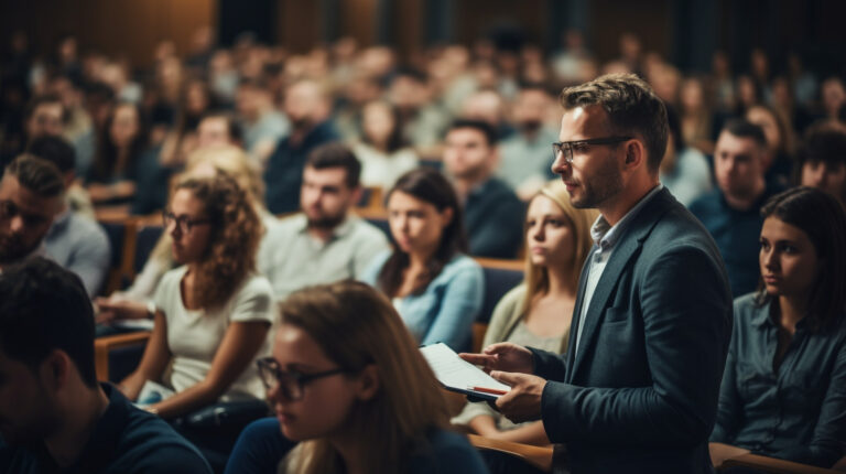 లెక్చర్ హాల్లో విద్యార్థుల సమూహం. ముందు ఒక ప్రొఫెసర్ ఉపన్యాసం ఇస్తున్నాడు.