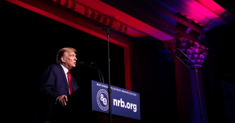 మాజీ అధ్యక్షుడు డొనాల్డ్ జె. ట్రంప్ తరచుగా తన అధ్యక్ష ఎన్నికల ప్రచారాన్ని అమెరికా భవిష్యత్తు కోసం యుద్ధంగా అభివర్ణించారు. కానీ గురువారం నాష్‌విల్లేలోని క్రిస్టియన్ బ్రాడ్‌కాస్టింగ్ మీడియా కన్వెన్షన్‌లో మాట్లాడుతూ, అతను తన రాజకీయ ప్రత్యర్థులను “చెడు” వ్యవస్థలో భాగంగా చిత్రీకరిస్తూ స్పష్టమైన మంచి-చెడు-చెడు ఫ్రేమ్‌వర్క్‌లో ఆ చిత్రణను చుట్టాడు.