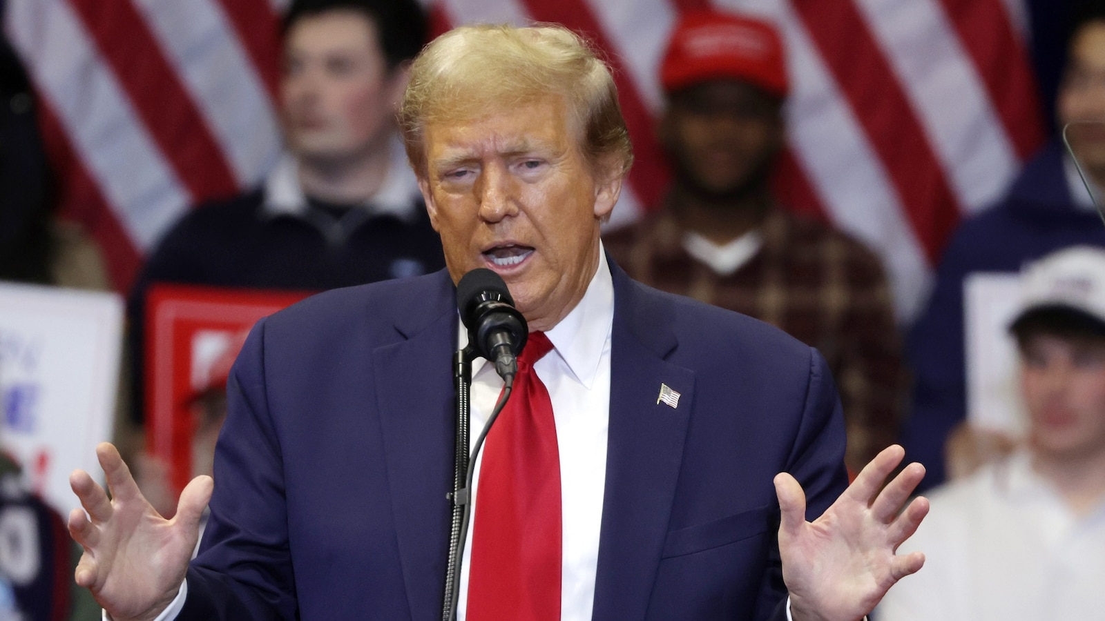ఫిబ్రవరి 23, 2024న సౌత్ కరోలినాలోని రాక్ హిల్లోని విన్త్రోప్ కొలీజియంలో జరిగిన ప్రచార కార్యక్రమంలో రిపబ్లికన్ అధ్యక్ష అభ్యర్థి మరియు మాజీ అధ్యక్షుడు డొనాల్డ్ ట్రంప్ ప్రసంగించారు.