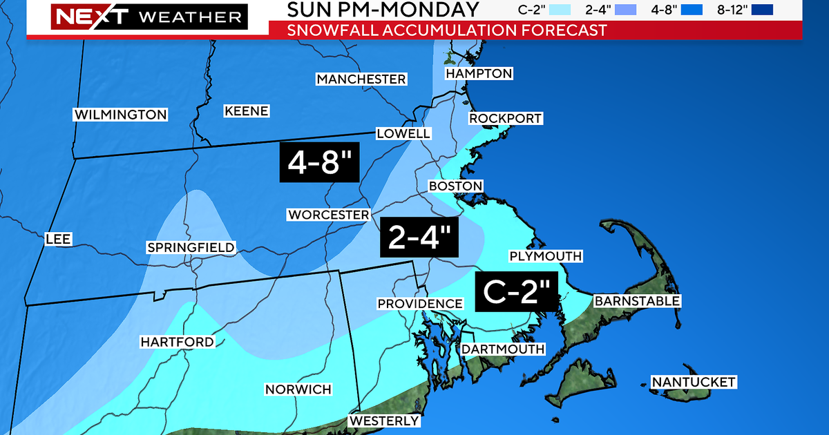 పూత -2″ – అతి తక్కువ హిమపాతం కేప్ ఆన్ నుండి బోస్టన్ వరకు మరియు ఆగ్నేయ మసాచుసెట్స్ వరకు తీరప్రాంతంలో ఉంటుంది. సోమవారం తుఫాను ముగిసే సమయానికి ఇదంతా జరుగుతుంది.