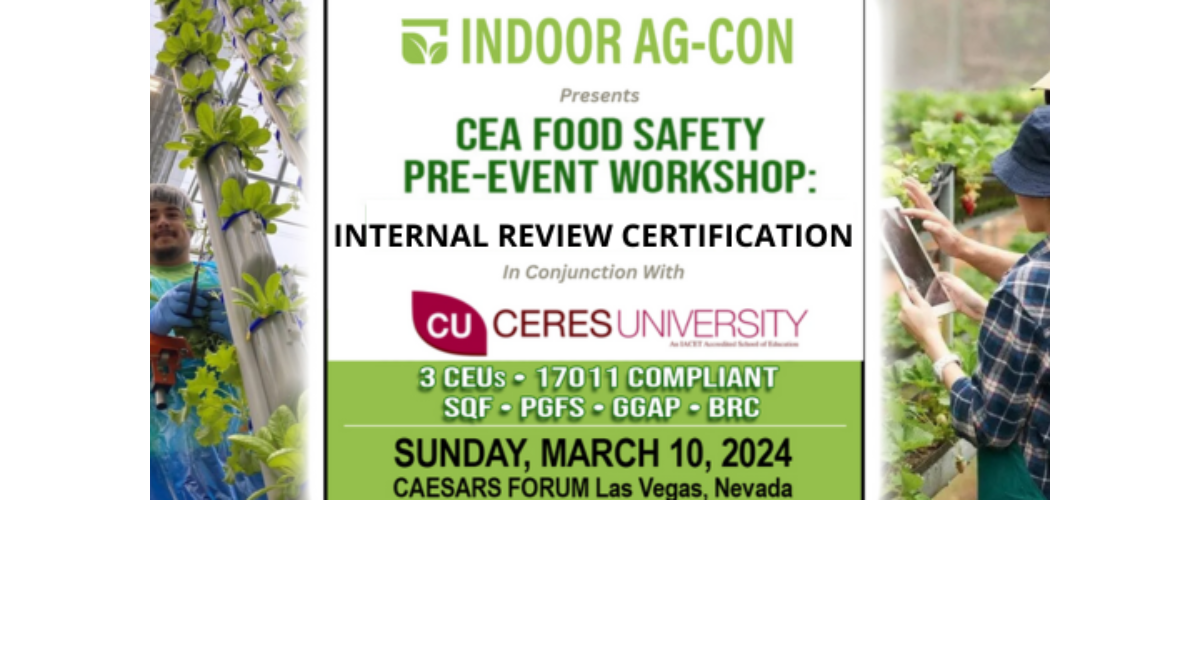 లాస్ వేగాస్ – ఇండోర్ ఆగ్-కాన్, నియంత్రిత పర్యావరణ వ్యవసాయం (CEA), గ్రీన్హౌస్లు మరియు నిలువు వ్యవసాయం కోసం అతిపెద్ద వాణిజ్య ప్రదర్శన మరియు సమావేశం, సెరెస్ విశ్వవిద్యాలయం, ICET గుర్తింపు పొందిన ఆహార భద్రత శిక్షణ మరియు ధృవీకరణ యొక్క ప్రముఖ ప్రొవైడర్గా, CEA ఫుడ్ సేఫ్టీ వర్క్షాప్ మార్చి 11-12, 2024న లాస్ వెగాస్లోని సీజర్స్ ఫోరమ్లో ఇండోర్ ఆగ్-కాన్ ముందస్తుగా. మార్చి 10, 2024 ఆదివారం మధ్యాహ్నం 1:00 నుండి సాయంత్రం 5:00 వరకు షెడ్యూల్ చేయబడింది. “అంతర్గత పరీక్ష ధృవీకరణ” పరిశ్రమ నిపుణులు తమ కెరీర్ను నిర్మించుకోవడంలో మరియు అటువంటి పరిస్థితుల కోసం సిద్ధం చేయడంలో సహాయపడటానికి రూపొందించబడింది: గ్లోబల్ ఫుడ్ సేఫ్టీ ఇనిషియేటివ్ (GFSI) అంతర్గత ఆడిట్ ధృవీకరణ అవసరాలు.