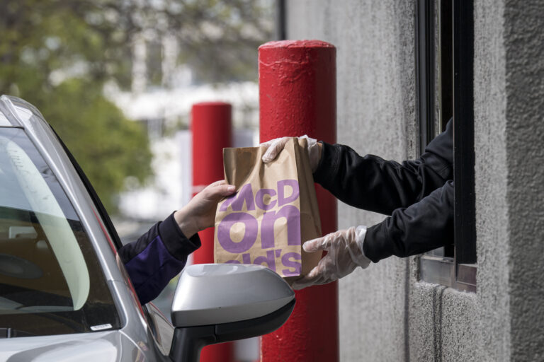 కాలిఫోర్నియాలోని ఓక్ల్యాండ్లో 2020 ఏప్రిల్ 9న మెక్డొనాల్డ్స్ రెస్టారెంట్లో ఒక ఉద్యోగి డ్రైవ్-త్రూ విండో ద్వారా కస్టమర్కు ఆర్డర్ను అందజేసారు.