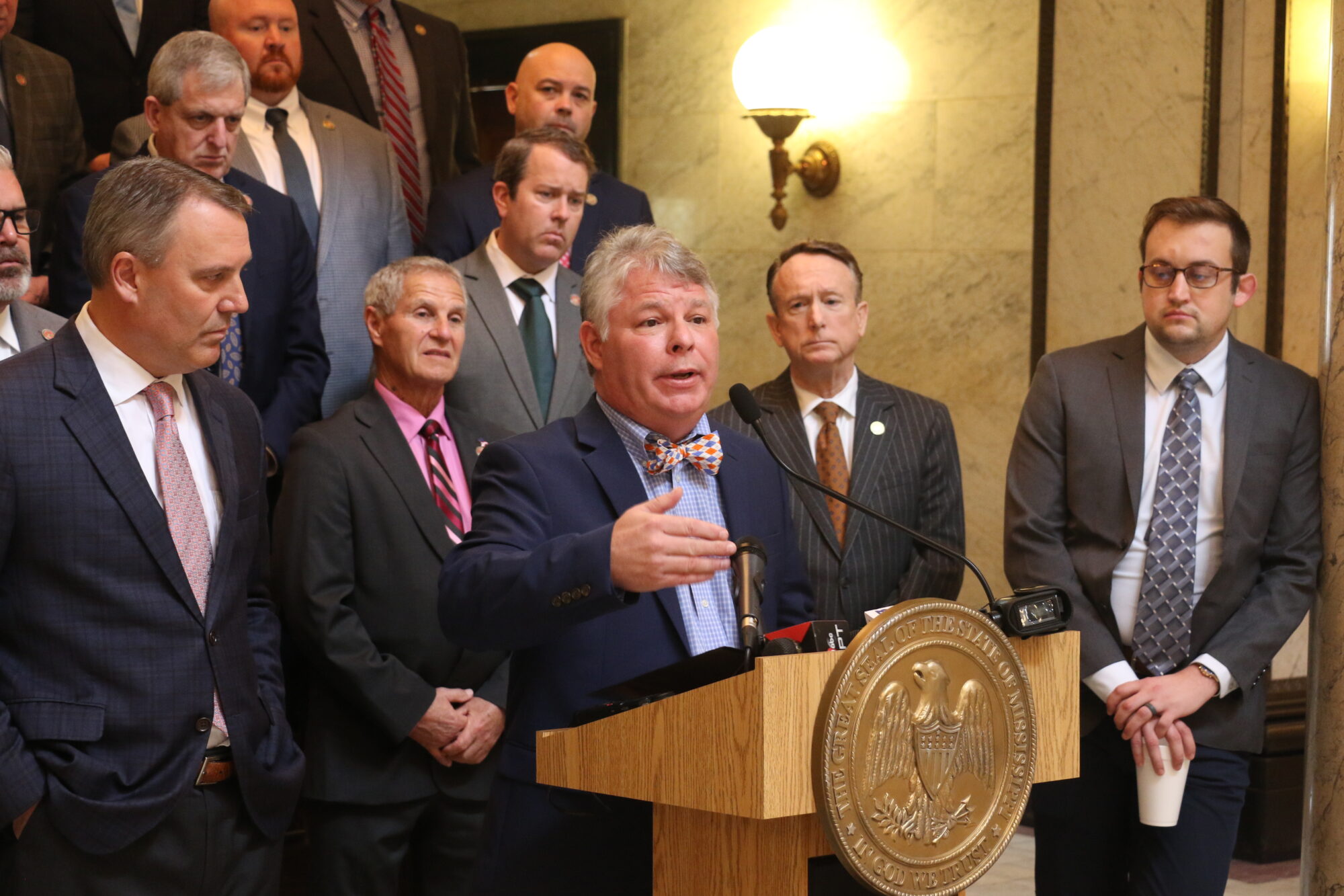 కాంగ్రెస్ సభ్యుడు రాబ్ రాబర్సన్ గురువారం మీడియా సమావేశంలో INSPIRE చట్టం యొక్క ఆమోదం గురించి మీడియాను ఉద్దేశించి ప్రసంగించారు, ఇది ప్రస్తుత MAEP విద్యా నిధుల నమూనాను భర్తీ చేసే మిస్సిస్సిప్పికి విద్యా నిధులను పెంచే లక్ష్యంతో రూపొందించిన బిల్లు. (ఫోటో జెరెమీ పిత్తారి | మాగ్నోలియా ట్రిబ్యూన్)