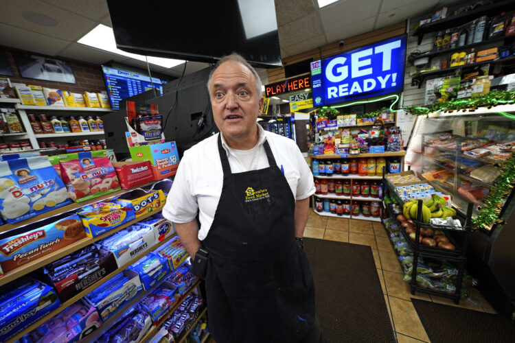 డాన్ సెరాఫిన్, ఎరీ, పెన్సిల్వేనియాలోని సెరాఫిన్స్ ఫుడ్ మార్కెట్ యజమాని. మార్చి 22, 2024 శుక్రవారం మార్కెట్లో ఉంది. మొత్తం సూర్యగ్రహణాన్ని వీక్షించడానికి ఏప్రిల్ 8న ఎరీకి చేరుకునే ప్రేక్షకుల కోసం సెరాఫిన్ నిల్వ చేస్తోంది. . (AP ఫోటో/జీన్ జె. పాస్కర్)