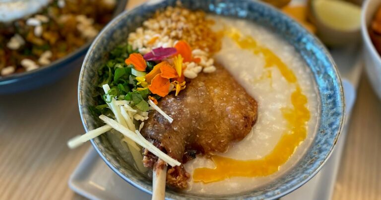 గంజి అన్ని కఠినమైన పరిస్థితులను ఉపశమనం చేస్తుంది. కరుణా యొక్క గంజి ($21) పొడవాటి ధాన్యపు బియ్యం మరియు ఓదార్పు అల్లంతో కలిపిన సూప్తో తయారు చేయబడింది. ఇది మంచిగా పెళుసైన మరియు లేత డక్ లెగ్ కాన్ఫిట్తో అగ్రస్థానంలో ఉంది మరియు ఉప్పగా, పగిలిపోయే చర్మం మరియు నెమ్మదిగా వండిన మాంసాన్ని కలిగి ఉంటుంది. శక్తివంతమైన మూలికలు మరియు తినదగిన పువ్వుల పాప్స్ మరియు ఉబ్బిన బియ్యం పైభాగాన్ని అలంకరించాయి, ప్రతి కాటులో రుచులు మరియు అల్లికల యొక్క ఉల్లాసభరితమైన కలయికను సృష్టిస్తుంది.