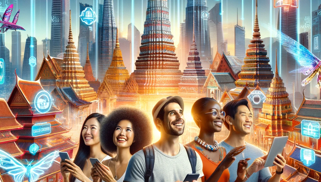 భవిష్యత్తులో ఏషియన్ ట్రావెల్ పరిశ్రమకు ఉత్పాదక AI ఎంత మేలు చేస్తుందో చూపించే చిత్రం. సాంప్రదాయ మరియు ఆధునిక వాస్తుశిల్పం, సాంకేతికతను ఉపయోగించే పర్యాటకులు మరియు స్థానిక పర్యాటక సమాచారాన్ని ప్రదర్శించే డ్రోన్లతో కూడిన శక్తివంతమైన నగర దృశ్యాన్ని చూడండి.