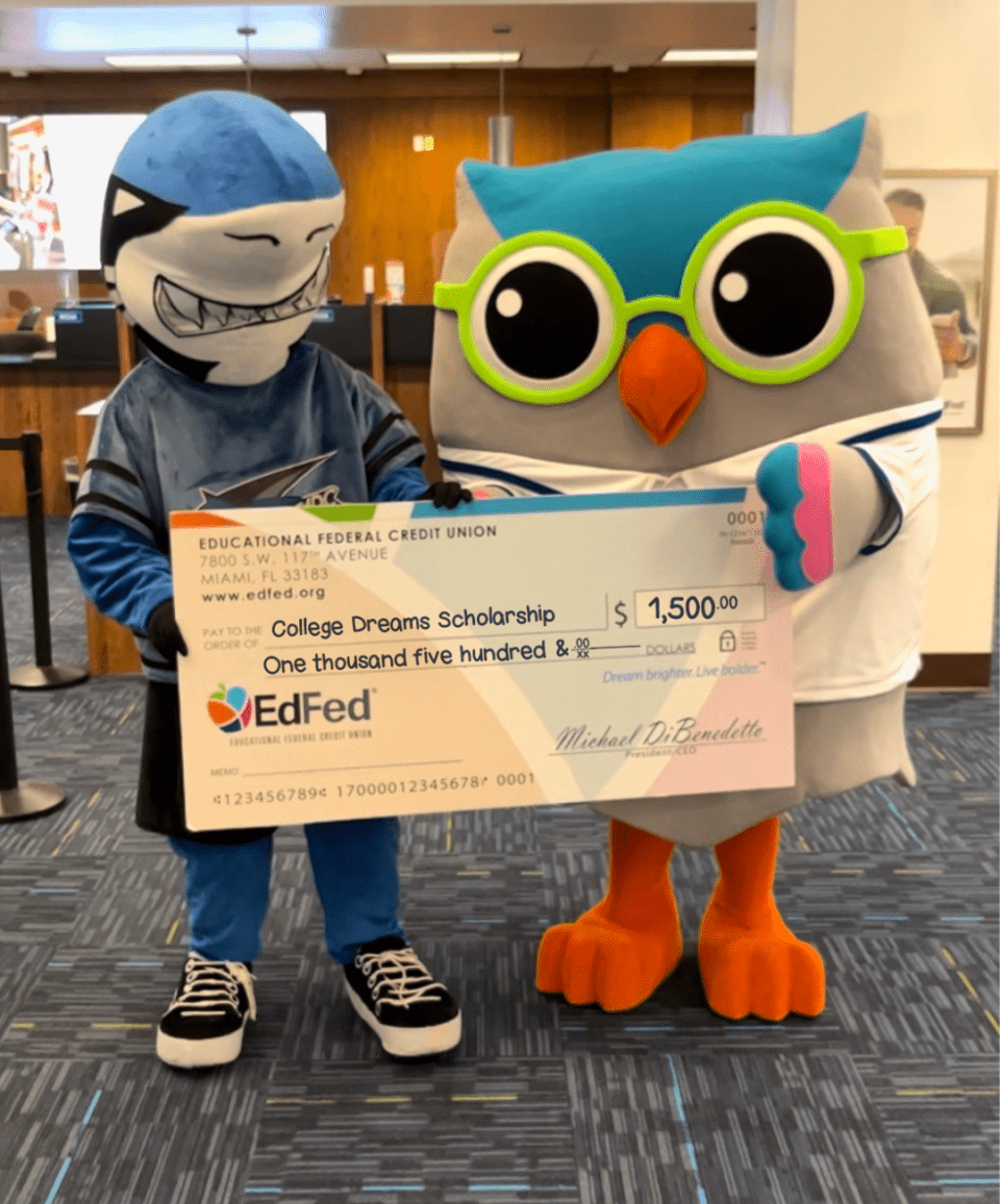 మయామి డేడ్ కాలేజ్ మస్కట్ ఫిన్ ది షార్క్ మరియు ఎడ్‌ఫెడ్ మస్కట్ ఎడ్డీ ది ఔల్ MDC విద్యార్థులకు ప్రతి నెలా అందించే $1,500 కాలేజ్ డ్రీమ్స్ స్కాలర్‌షిప్‌లలో ఒకదాన్ని అందించడానికి సిద్ధంగా ఉన్నాయి.