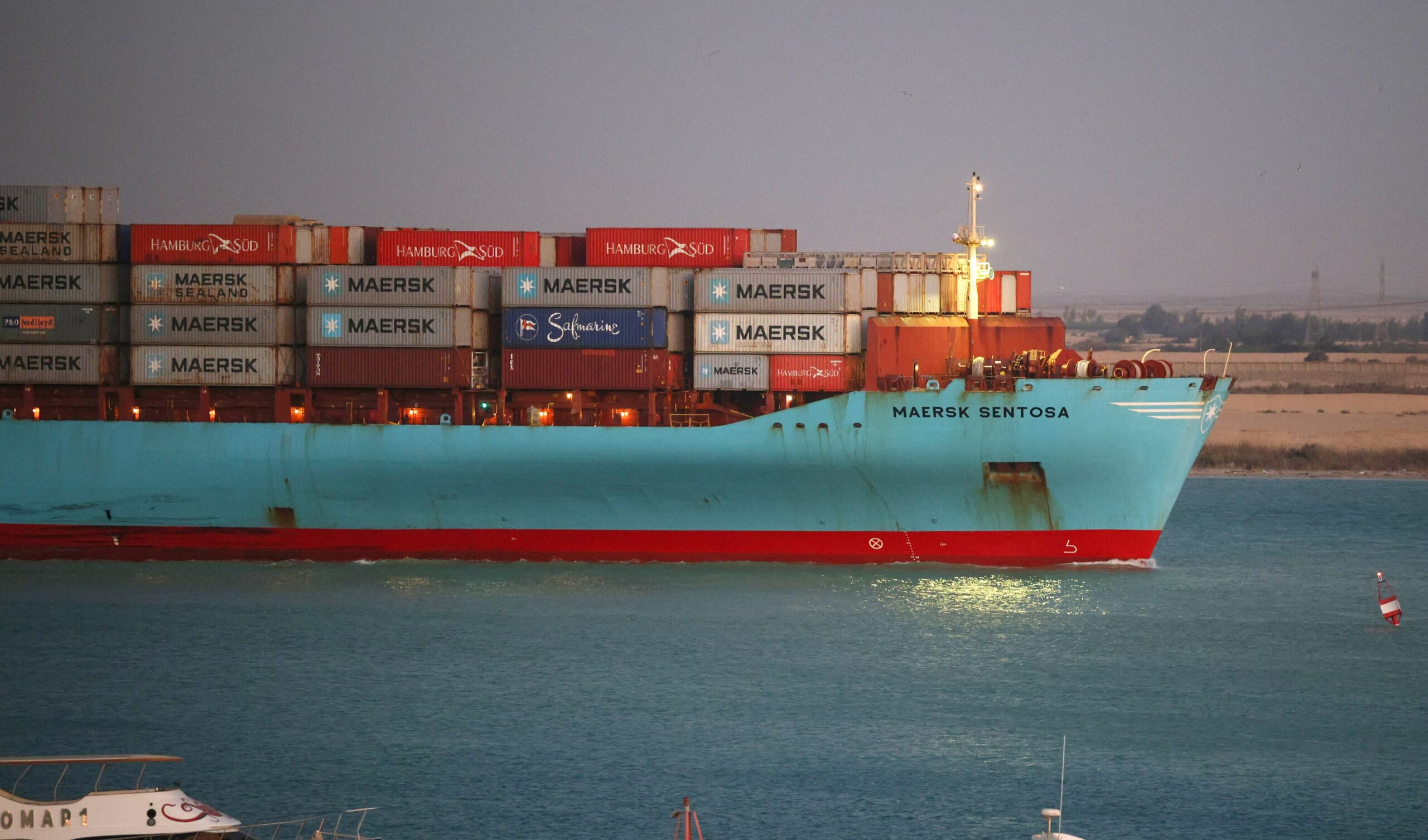 డిసెంబర్ 21, 2023, గురువారం, ఈజిప్ట్లోని సూయెజ్లోని సూయజ్ కెనాల్ నుండి నిష్క్రమించడానికి మెర్స్క్ సెంటోసా కంటైనర్ షిప్ దక్షిణాన ప్రయాణిస్తుంది.