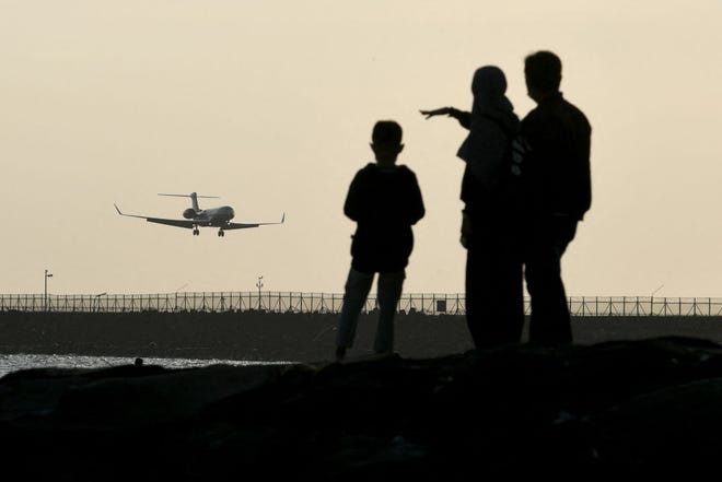 జూన్ 1, 2023న ఇండోనేషియా రిసార్ట్ ద్వీపం బాలిలోని I Gusti Ngurah Rai అంతర్జాతీయ విమానాశ్రయంలో విమానం దిగడాన్ని ప్రజలు చూస్తున్నారు. అమెరికన్ పర్యాటకులకు వీసా అవసరమయ్యే అనేక దేశాలలో ఇండోనేషియా ఒకటి.
