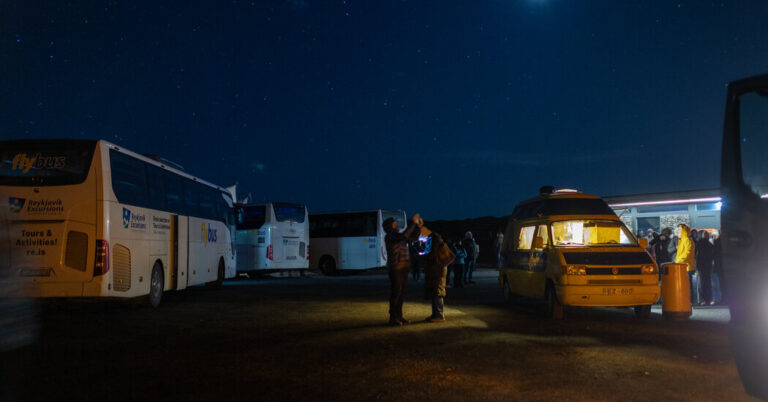 నా మొదటి రాత్రి అరోరా స్టాకింగ్లో, మిస్టర్ రిక్టర్ హెచ్చరికలు ఉన్నప్పటికీ, నేను రెక్జావిక్ విహారయాత్రల మినీబస్సులో కాబోయే తల్లుల సమూహంలో చేరాను. $88కి, నగరంలోని సెంట్రల్ బస్ స్టేషన్ నుండి రాత్రి 9:30 గంటలకు బయలుదేరిన 19 మంది ప్రయాణికుల బస్సులో నేను కూర్చోగలిగాను.