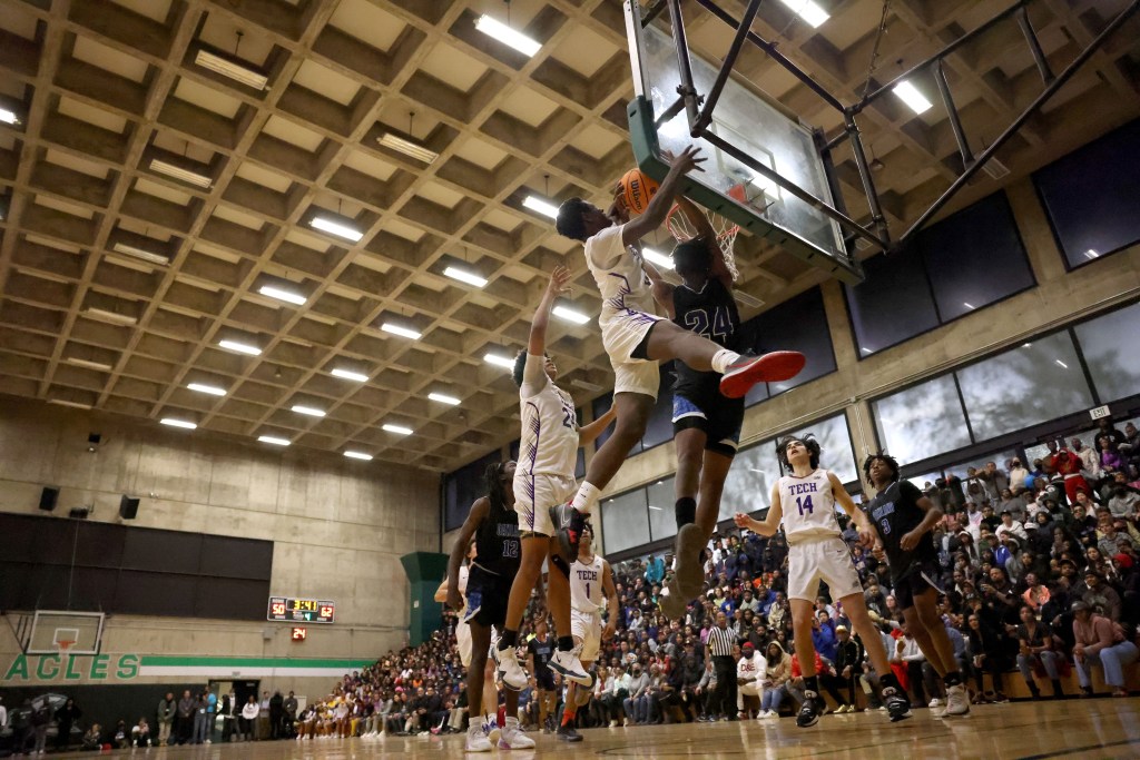Oakland High School మరియు Oakland Tech మంగళవారం, మార్చి, Oakland, Oakland, Laney College Gymలో CIF నార్తర్న్ కాలిఫోర్నియా డివిజన్ III ఛాంపియన్షిప్ గేమ్ రెండవ సగం సమయంలో పేలవమైన కాంతి పరిస్థితులలో ఆడాయి. జూలై 7, 2023 (రే చావెజ్/బే ఏరియా న్యూస్ గ్రూప్)