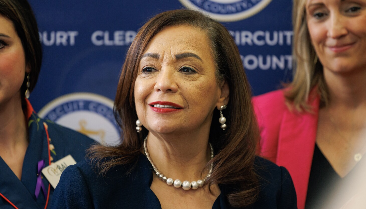 కుక్ కౌంటీ సర్క్యూట్ కోర్ట్ క్లర్క్ ఐరిస్ Y. మంగళవారం, మార్చి 12, 2024, డేలీ సెంటర్, 50 W. వాషింగ్టన్ సెయింట్లోని లూప్లో జరిగిన విలేకరుల సమావేశంలో మహిళల గోప్యతా హక్కు చొరవ గురించి వ్యాఖ్యలను విన్నారు.・మిస్టర్ మార్టినెజ్.