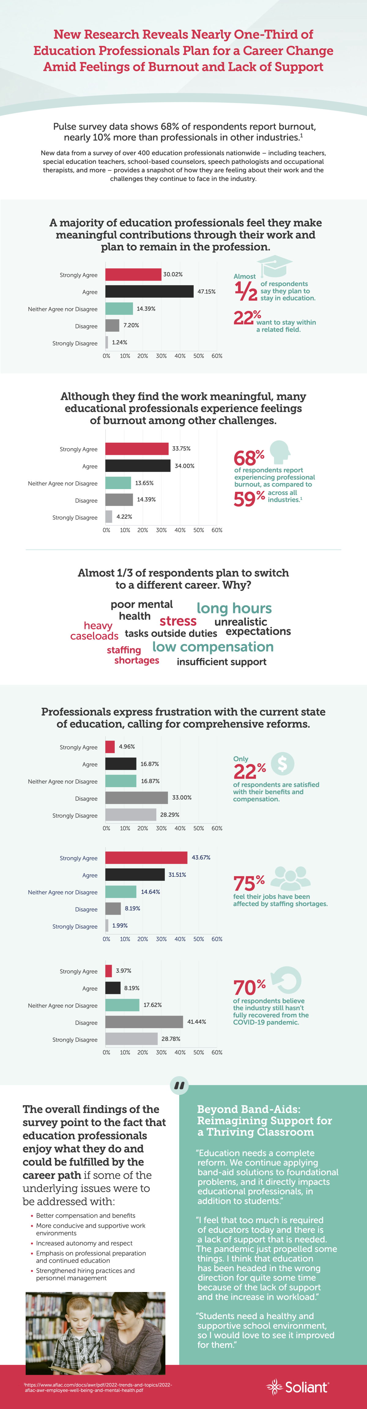 ATLANTA, Ga., ఫిబ్రవరి 7, 2024 (గ్లోబ్ న్యూస్‌వైర్) — ఈరోజు విడుదల చేసిన కొత్త సర్వే డేటా ప్రకారం చాలా మంది విద్యా నిపుణులు తమ పనిని అర్ధవంతంగా భావిస్తారు, ఇటీవలి పరిశోధన చూపిస్తుంది అమెరికన్లు దాని కంటే ఎక్కువ బర్న్‌అవుట్‌ను ఎదుర్కొంటున్నారని అధ్యయనం చూపిస్తుంది జాతీయ సగటు. వాస్తవానికి, 20% కంటే ఎక్కువ మంది సంబంధిత రంగంలోకి వెళ్లాలని ప్లాన్ చేస్తున్నారు మరియు 30% కంటే ఎక్కువ మంది కెరీర్ మార్పును పూర్తిగా పరిశీలిస్తున్నారు. హెల్త్‌కేర్ మరియు ఎడ్యుకేషన్ స్టాఫింగ్‌లో జాతీయ నాయకుడైన సోలియంట్, U.S. పాఠశాలలు ఎదుర్కొంటున్న సిబ్బంది సవాళ్లు మరియు అవకాశాలను పరిశ్రమ బాగా అర్థం చేసుకోవడానికి మరియు పరిష్కరించడంలో సహాయపడటానికి ఈ నివేదికను ప్రచురించింది.