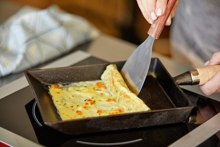 కూరగాయలతో కూడిన కాన్ఫెట్టి మరియు ప్రత్యేకమైన సుషీ లాంటి ఆకృతిని కలిగి ఉంటుంది, ఇది గుడ్లు తినడానికి నేను ఇప్పటివరకు చూడని అత్యంత ఆకర్షణీయమైన మార్గాలలో ఒకటి, కానీ పాన్ యొక్క ఒక వైపు నుండి గుడ్డు యొక్క పలుచని పొరను తీసివేయడం సులభం. దానిని మరొక వైపుకు తిప్పడం నన్ను ఆపివేసింది. మరొక పొరను పోయాలి మరియు ఒక రోల్ ఏర్పడే వరకు ముందుకు వెనుకకు పునరావృతం చేయండి. అది కలిసి ఉంటుందా?