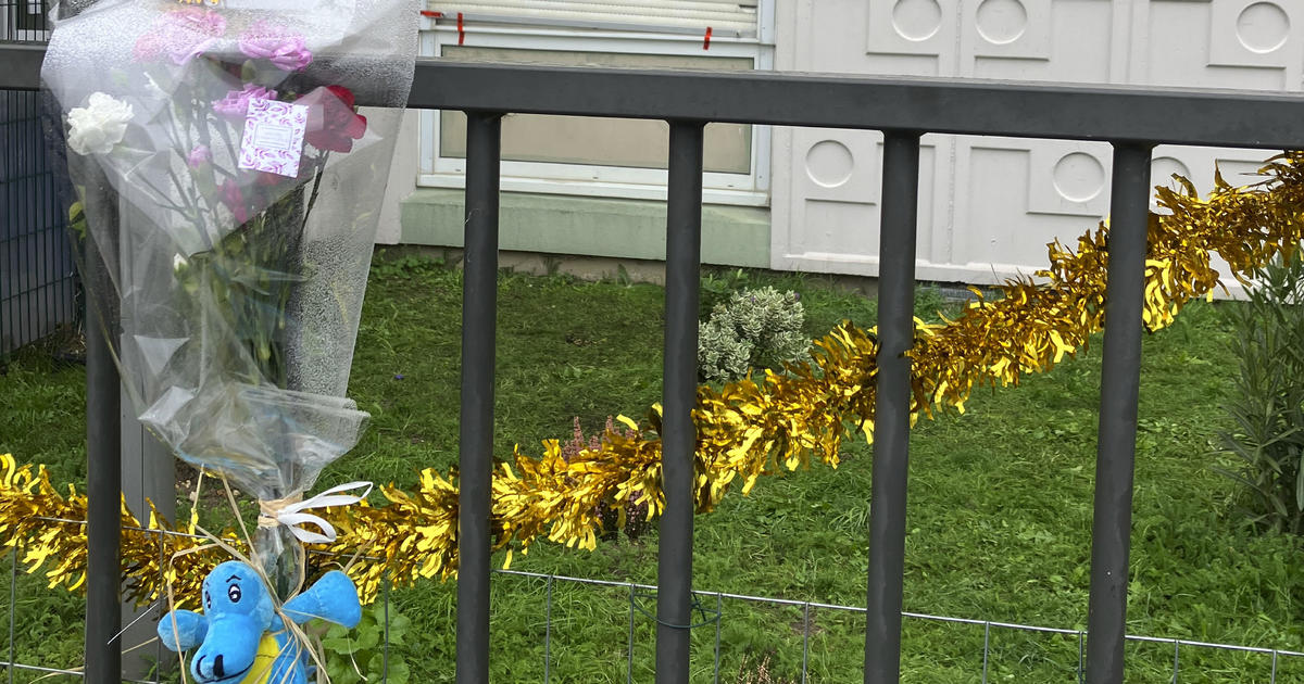 డిసెంబర్ 26, 2023న ఫ్రాన్స్‌లోని మీక్స్‌లో 9 నెలల నుండి 10 సంవత్సరాల వయస్సు గల నలుగురు పిల్లలు మరియు వారి తల్లి హత్యకు గురైన భవనం యొక్క గేట్ వద్ద పువ్వులు వేలాడుతున్నాయి.