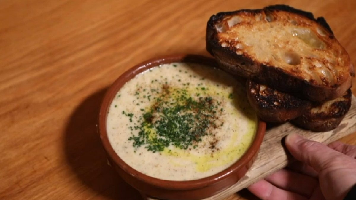 బేస్ షెర్రీ మరియు ఆలివ్ నూనెతో కలిపిన మార్కోనా బాదం ప్యూరీతో తయారు చేయబడింది మరియు తాజా పార్స్లీ, ఎండివ్ మరియు పుదీనాతో కాల్చిన రాడిచియో ఆకులు. కొద్దిగా మిరప నూనె జోడించడం చివరిలో తేలికపాటి కారంగా ఉంటుంది.