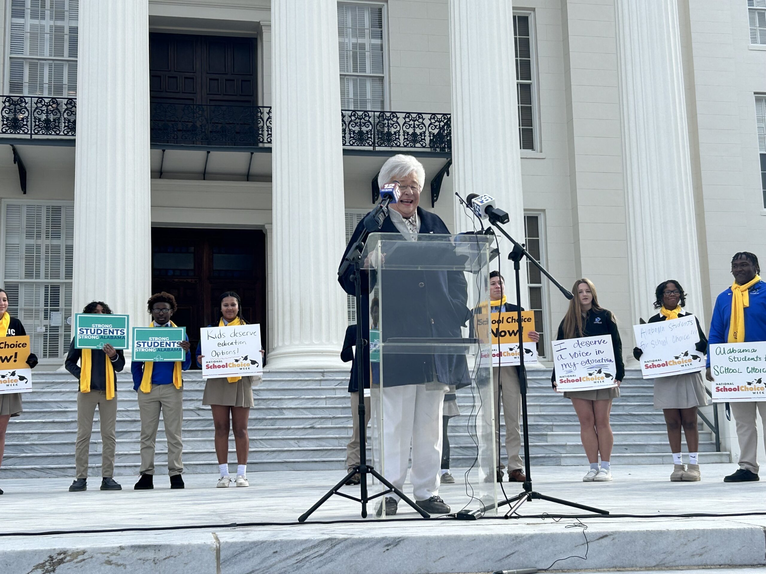 సోమవారం అలబామా స్టేట్ క్యాపిటల్ మెట్లపై జరిగిన ర్యాలీలో ఎడ్యుకేషన్ సేవింగ్స్ ఖాతాలకు తన మద్దతును గవర్నర్ కే ఐవీ పునరుద్ఘాటించారు.