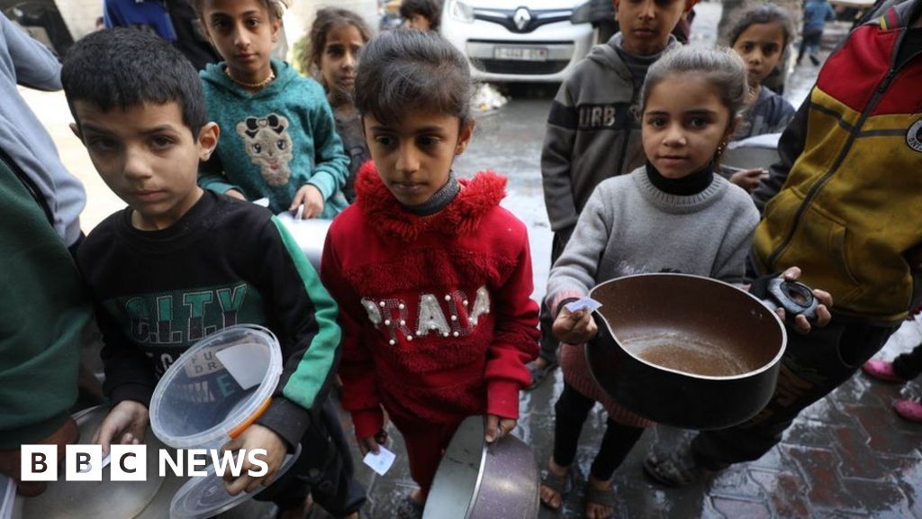 ఈ నెల ప్రారంభంలో గాజా నగరంలో ఆహారాన్ని పంపిణీ చేయడానికి సహాయక కార్మికులు కోసం ఖాళీ కుండలను పట్టుకొని పిల్లలు వేచి ఉన్నారు.