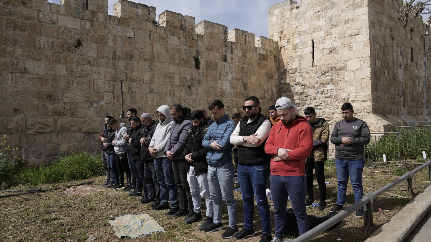 శుక్రవారం, మార్చి 1, 2024, శుక్రవారం ప్రార్థనల కోసం ఇజ్రాయెల్ పోలీసులు అల్ అక్సా మసీదు మైదానంలోకి ప్రవేశించడానికి నిరాకరించిన తర్వాత పాలస్తీనియన్ ముస్లింలు జెరూసలేం యొక్క ఓల్డ్ సిటీ గోడల వెలుపల ప్రార్థన చేస్తారు. (AP ఫోటో/మహ్మద్)・ఇరియన్)
