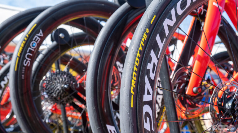 గుడ్ఇయర్లో ప్రోటోటైప్ లేదా టీమ్-స్పెసిఫిక్ టైర్లుగా కనిపించే కొన్ని కొత్త టైర్లు ఉన్నాయి. ఈ టైర్లు గుడ్ఇయర్ బైక్ల వెబ్సైట్లో వెక్టర్ LTD వెట్-వెదర్ రేస్ టైర్లుగా జాబితా చేయబడ్డాయి, అయితే వాటి ధర ఒక్కో జతకు భారీగా $650 మరియు 30-రోజుల డెలివరీ సమయం. UCI యొక్క వాణిజ్యీకరణ నియమాలు అని పిలవబడే వాటిని తప్పించుకోవడానికి ఇది స్పష్టమైన ప్రయత్నం. ఈ టైర్ TSS (హుక్లెస్) రిమ్లు మరియు TC (ట్యూబ్లెస్ క్రోట్చెట్, హుక్డ్ అని కూడా పిలుస్తారు) క్లించర్ రిమ్లతో ఉపయోగం కోసం రూపొందించబడింది. వెక్టర్ LTD యొక్క ట్రెడ్ ప్యాటర్న్ వెక్టర్ స్పోర్ట్ యొక్క ట్రెడ్ ప్యాటర్న్తో దగ్గరి సంబంధం కలిగి ఉంటుంది మరియు దానికి సమానంగా ఉంటుంది. ఇది మృదువైన మధ్య భాగం, ఫిష్హుక్ లాంటి పొడవైన కమ్మీలు మరియు ఎత్తైన భుజాలను కలిగి ఉంటుంది, ఇవన్నీ బహుశా తడి వాతావరణంలో పట్టును మెరుగుపరచడానికి రూపొందించబడ్డాయి. గుడ్ఇయర్ వెబ్సైట్ వెక్టర్ LTD యొక్క 28mm మరియు 30mm వెర్షన్లను జాబితా చేస్తుంది, అయితే హ్యూమన్ పవర్డ్ హెల్త్ 30mm ఎంపికను ఉపయోగించింది. రిడిల్ ట్రెక్ పురుషుల మరియు మహిళల జట్లు మునుపటి సీజన్లో చాలా వరకు పిరెల్లిస్ ప్రోటోటైప్లో పోటీ పడ్డాయి. కొత్త టైర్ల గురించి ఇంకా వివరాలు లేవు, కానీ టీమ్ సిబ్బంది నన్ను కాలిపర్లతో టైర్లను కొలవకుండా నిషేధించారు. అయితే, నేను దానిని తాకినప్పుడు అది జారిపోనట్లు అనిపించింది. కృతజ్ఞతగా, పురుషుల బైక్లలో ఒకదానిపై ఉన్న ఈ సైడ్వాల్ స్టాంప్ మరియు టిపెక్స్ పెన్ మీకు సుమారు వెడల్పును అందిస్తాయి.రిడిల్ ట్రెక్ మహిళల బృందం కూడా ప్రోటోటైప్ టైర్లతో పోటీ పడింది…అయితే, వారు కొత్త టైర్ యొక్క 28mm వెర్షన్ను ఎంచుకున్నట్లు తెలుస్తోంది. పిరెల్లి ట్యూబ్యులర్ టైర్లను రేసింగ్ చేసే రిడ్ల్ ట్రెక్ రైడర్ మ్యాడ్స్ పెడెర్సన్ మాత్రమే. ఇంతలో, Liv AlUla Jayco టీమ్లో చాలా మంది విట్టోరియా కోర్సా కంట్రోల్ ట్యూబులర్లపై పోటీ పడ్డారు, ఇది టీమ్-స్పెసిఫిక్ కాడెక్స్ అల్ట్రా 50 ట్యూబులర్ రిమ్లతో అమర్చబడింది.ఇంతలో, SD వర్క్స్, సౌడల్ క్విక్స్టెప్ మరియు బోరా-హన్స్గ్రోహె అందరూ 28mm క్లించర్ టర్బో కాటన్ హెల్ ఆఫ్ ది నార్త్లో పోటీ పడ్డారు, బహుశా లోట్టే కోపెక్ యొక్క టార్మాక్ SL8లో చూసినట్లుగా, లేటెక్స్ ఇన్నర్ ట్యూబ్లతో. UAE టీమ్ ఎమిరేట్స్ దాని కాంటినెంటల్ GPలో అరుదుగా కనిపించే ‘పారదర్శక’ సైడ్వాల్లను ఇన్స్టాల్ చేసింది, బహుశా టీమ్లు ISO స్టాండర్డ్-కాంప్లైంట్ కాంబినేషన్ను అనుసరించాలని గురువారం UCI చేసిన ప్రకటన తర్వాత 30mm టైర్లను పొందాలనే తొందరలో ఉండవచ్చు. నేను దానిని 5000 S TR నుండి తీసుకున్నాను. ఎన్వ్ 4.5 రిమ్లు 25 మిమీ అంతర్గత రిమ్ వ్యాసం కలిగి ఉన్నందున, ఈ ప్రకటన ప్రకారం టీమ్ యుఎఇ రైడర్లు వారు సాధారణంగా ఉపయోగించే 28 ఎం