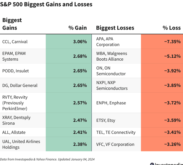 • S&P 500 ఇండెక్స్ జనవరి 4, 2024 గురువారం నాడు 0.3% పడిపోయింది, ఇది సంవత్సరాన్ని ప్రారంభించడానికి US స్టాక్‌లు తమ పాదాలను కనుగొనడానికి కష్టపడుతున్నందున వరుసగా మూడవ రోజు క్షీణతను సూచిస్తుంది.
