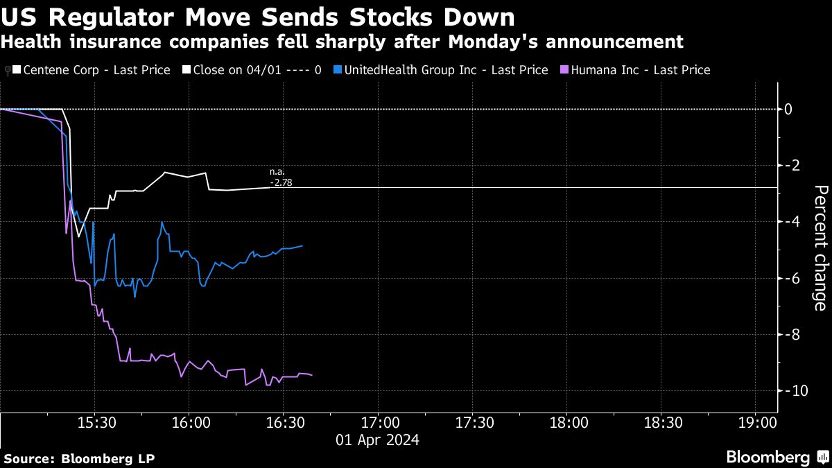 ప్రధాన బీమా కంపెనీలలో మెడికేర్కు అత్యధికంగా బహిర్గతం అయిన హుమానా, పొడిగించిన న్యూయార్క్ ట్రేడింగ్లో 5:48 p.m. నాటికి 9.4% తగ్గింది. అతిపెద్ద U.S. ఆరోగ్య బీమా కంపెనీ యునైటెడ్హెల్త్ గ్రూప్ 4.6%, CVS హెల్త్ కార్పొరేషన్ 5.2% పడిపోయాయి. ఎలివెన్స్ హెల్త్ 4.1% మరియు సెంటెన్ 2.8% పడిపోయింది.