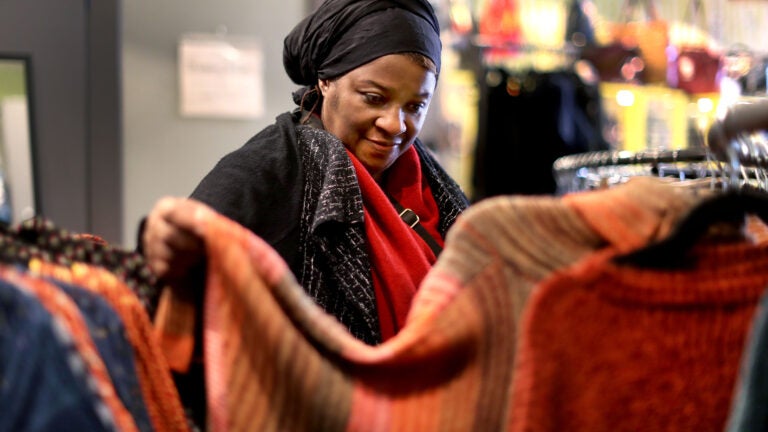 చిన్న వ్యాపారం శనివారం, నవంబర్ 30, 2019, జమైకా ప్లెయిన్లోని సెంటర్ స్ట్రీట్ స్టోర్కు పెద్ద సంఖ్యలో దుకాణదారులను ఆకర్షించింది. ఏంజెలా సబీర్ ఆన్ సెంటర్ స్టోర్లో స్వెటర్లను చూస్తోంది. (ఫోటో జాన్ తుర్మచి/గ్లోబ్ స్టాఫ్)