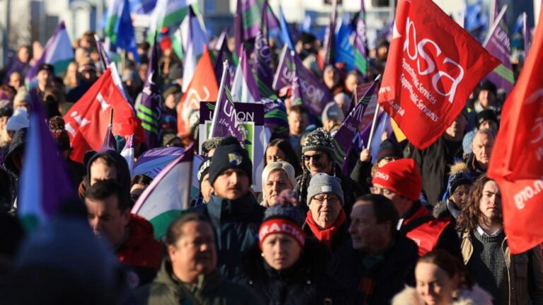 బెల్ఫాస్ట్, నార్తర్న్ ఐర్లాండ్ — రాజకీయ గ్రిడ్లాక్ మరియు పని చేసే ప్రభుత్వం లేని ప్రాంతం, కొన్ని వేతనాల పెంపుతో నిరసనగా ఉత్తర ఐర్లాండ్ అంతటా పదివేల మంది ప్రభుత్వ రంగ కార్మికులు గురువారం ఉద్యోగానికి దూరంగా ఉన్నారు.