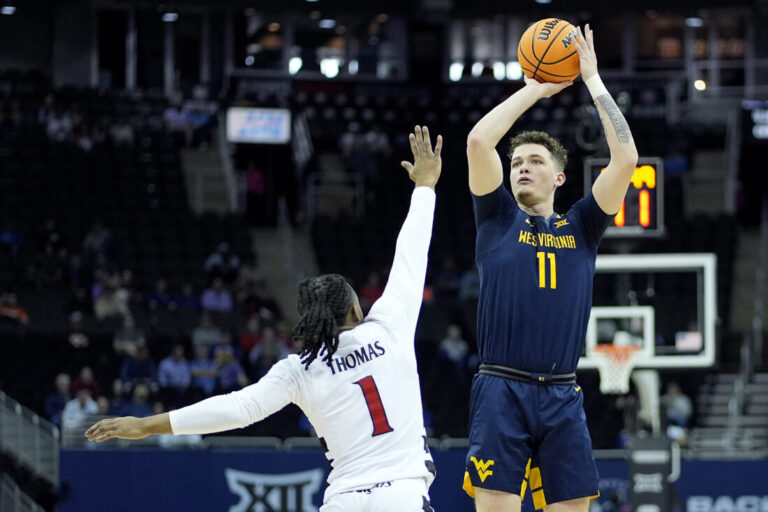 వెస్ట్ వర్జీనియా ఫార్వర్డ్ క్విన్ స్లాజిన్స్కి, 11, కాన్సాస్ సిటీ, మిస్సౌరీలో మంగళవారం, మార్చి 12, 2024 నాడు NCAA కాలేజీ బాస్కెట్బాల్ గేమ్ మొదటి అర్ధభాగంలో సిన్సినాటి ఫార్వర్డ్ కాల్ ఎజిక్పే, 1ని కాల్చాడు. (AP ఫోటో/చార్లీ రీడెల్)