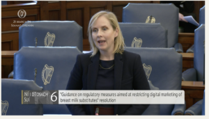 బాగా, గత సంవత్సరం ఆన్లైన్ భద్రత మరియు మీడియా నియంత్రణ బిల్లు తల్లి పాల ప్రత్యామ్నాయాలను పరిమితం చేయాలనే మా స్వంత అభ్యర్థనను మంత్రి కేథరీన్ మార్టిన్ అంగీకరించినందుకు మేము సంతోషించాము. ఇది ఎందుకు ముఖ్యమైనది?తల్లి పాల ప్రత్యామ్నాయాల అనియంత్రిత విక్రయాలు తల్లిపాలను రేటును తగ్గిస్తాయని మాకు తెలుసు. ఇక్కడ ఐర్లాండ్లో మాకు అధిక మార్కెట్ ఉన్న పరిశ్రమ ఉందని కూడా మాకు తెలుసు. కాబట్టి తల్లి పాల ప్రత్యామ్నాయాల కోసం ఆన్లైన్ మార్కెటింగ్ అంటే ఏమిటి? దాని అర్థం ఏమిటి? ఇది నిర్దిష్ట వయస్సు ఉన్న మహిళలను లక్ష్యంగా చేసుకుంటుంది. వారు అర్ధరాత్రి తమ చిన్న శిశువుకు ఆహారం ఇవ్వడానికి కష్టపడవచ్చు లేదా వారు మద్దతు కోసం ఇంటర్నెట్ని ఆశ్రయించవచ్చు లేదా వారు తల్లిపాలను మద్దతు కోసం చూస్తున్నారని టైప్ చేయవచ్చు. ప్రదర్శించబడినది పాల పొడికి సంబంధించిన ప్రకటన. మరియు మద్దతు లేకుండా, ఇది పరిష్కారం అని అనుకోవడం సులభం అనడంలో సందేహం లేదు, కానీ వాస్తవానికి, మేము మహిళలను విఫలమవుతున్నాము. అత్యంత ప్రచారం చేయబడిన ఈ ఉత్పత్తిని ఉపయోగించడం ద్వారా తల్లిపాలు ఇవ్వాలనుకునే మహిళలకు మేము భరోసా ఇస్తున్నాము. ఫార్ములా యాక్సెస్ని అస్సలు పరిమితం చేయకూడదు. వారు తమ బిడ్డకు పాలు ఎలా తినిపించాలనేది కుటుంబం యొక్క వ్యక్తిగత ఎంపిక.