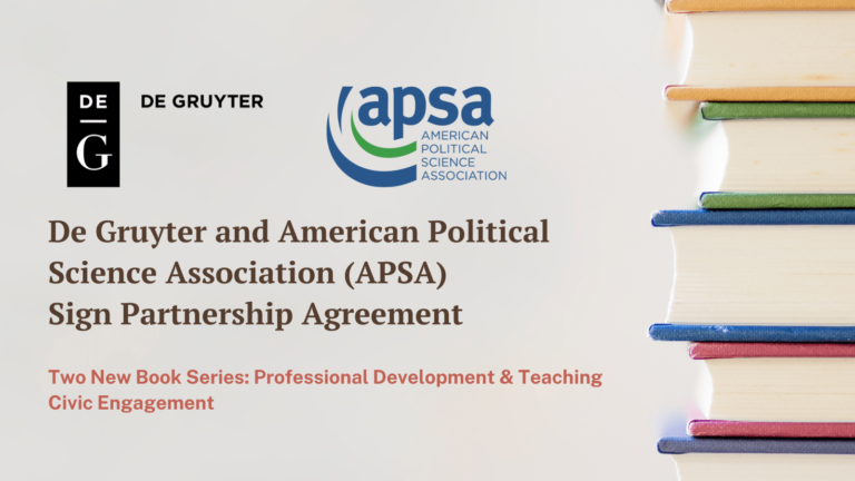 డి గ్రుయిటర్ మరియు అమెరికన్ పొలిటికల్ సైన్స్ అసోసియేషన్ (APSA) రెండు కొత్త పుస్తక ధారావాహికలను ప్రచురించడానికి సహకార భాగస్వామ్య ఒప్పందాన్ని ప్రకటించడానికి సంతోషిస్తున్నాము: De Gruyter-APSA ఎడ్యుకేషనల్ సివిక్ ఎంగేజ్మెంట్ సిరీస్ మరియు De Gruyter-APSA పొలిటికల్ సైన్స్ ప్రొఫెషనల్ డెవలప్మెంట్ సిరీస్.