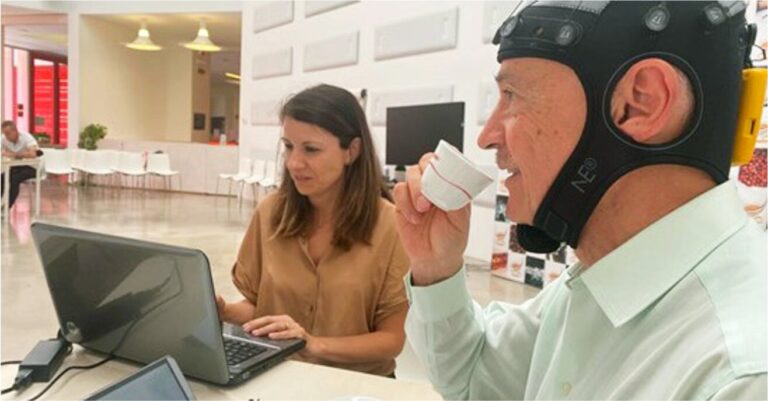 జూలై 2022లో ఇటలీలోని మిలన్లోని బినాస్కోలోని ముమాక్ అకాడమీ మైదానంలో జరిగిన ఇంటర్నేషనల్ కాఫీ టేస్టింగ్ 2022 సమ్మర్ సెషన్లో EEG రికార్డింగ్ సమయంలో పర్యవేక్షించబడిన ప్యానెలిస్ట్ యొక్క ఉదాహరణ.అందించినది: ఇటాలియన్ నేషనల్ రీసెర్చ్ కౌన్సిల్