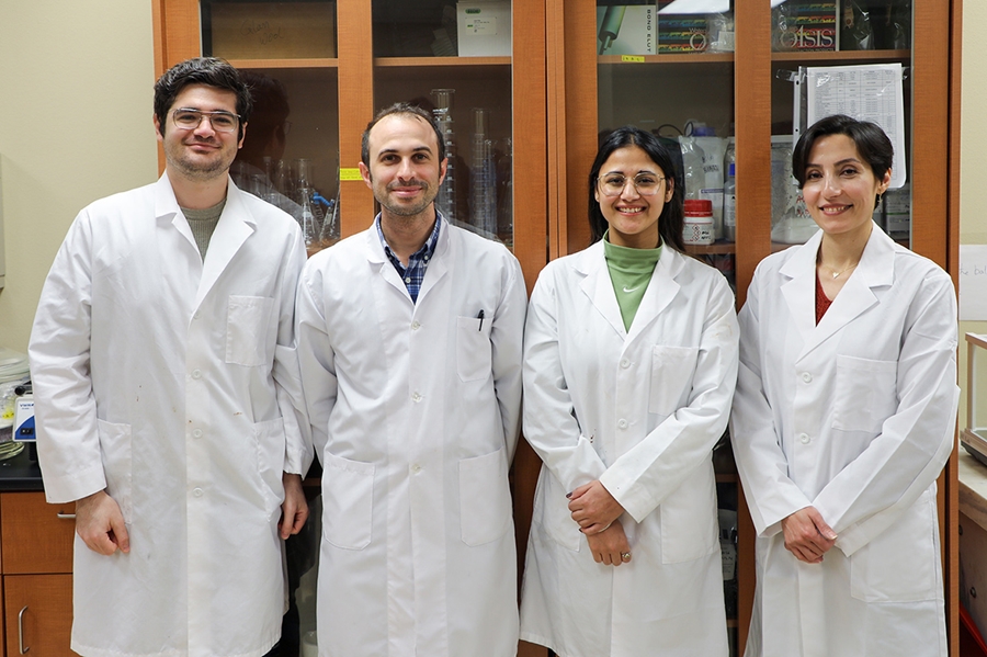ఫుడ్ సైన్స్ అసిస్టెంట్ ప్రొఫెసర్ అలీ ఉబైత్గుల్లారి (ఎడమ నుండి రెండవది), సఫౌలా అహ్మద్జాదేహ్, సుమన్జోత్ కౌర్ మరియు అర్దా తుహానియోగ్లు (అందరూ Ph.D.). విద్యార్థి.
