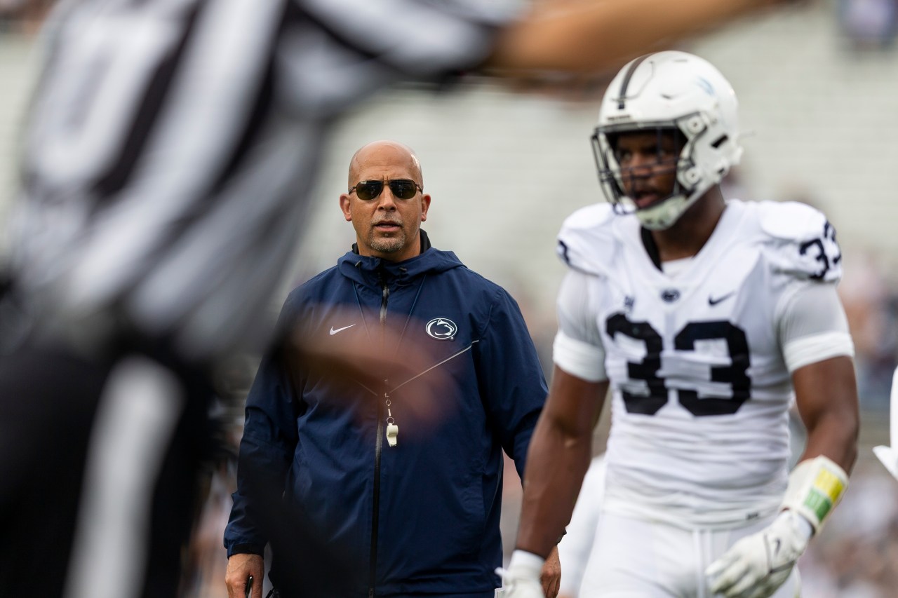 పెన్సిల్వేనియాలోని స్టేట్ కాలేజీలో శనివారం, ఏప్రిల్ 15, 2023న NCAA కళాశాల ఫుట్బాల్ జట్టు బ్లూ-వైట్ స్ప్రింగ్ గేమ్ రెండవ త్రైమాసికంలో పెన్ స్టేట్ కోచ్ జేమ్స్ ఫ్రాంక్లిన్ డిఫెన్సివ్ ఎండ్ డాని డెన్నిస్ సుట్టన్తో మాట్లాడాడు. (జో హెర్మిట్/పేట్రియాట్-న్యూస్ AP ద్వారా)