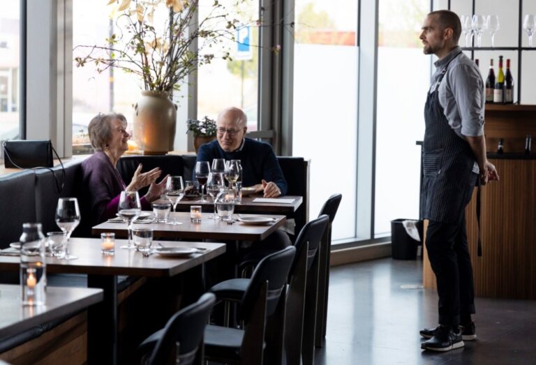 సర్వర్ జస్టిన్ బోర్గోయిన్ ఏప్రిల్ 2022లో హెల్మ్ ఓస్టెర్ బార్ & బిస్ట్రోలో ఫాల్మౌత్ యొక్క సాండ్రా లిప్సే మరియు బిల్ షేన్‌లతో మాట్లాడాడు. మిచెల్ మెక్‌డొనాల్డ్/ఫోటో ఎడిటర్, ఫైల్
