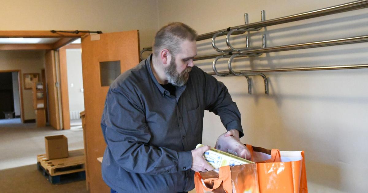 ఫస్ట్ ప్రెస్బిటేరియన్ చర్చిలో ఫుడ్ ప్యాంట్రీ కోఆర్డినేటర్ అయిన జాన్ ఫాన్ఖౌజర్, మార్చి 18వ తేదీ సోమవారం రాత్రి చర్చి ఆహార పంపిణీలో ఎవరైనా తీసుకోవడానికి ప్రోటీన్ బ్యాగ్లను ప్రోటీన్తో నింపారు.