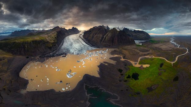 “ఈ 360-డిగ్రీల పనోరమా డ్రోన్తో సంగ్రహించబడింది. ఇది స్కాఫ్టాఫెల్స్జోకుల్ హిమానీనదం నుండి హిమనదీయ సరస్సు, హిమనదీయ నది మరియు నేపథ్యంలో సాగరం వరకు మొత్తం హిమనదీయ నీటి ప్రవాహాన్ని చూపుతుంది.”