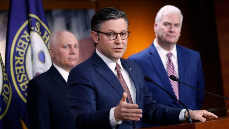 హౌస్ స్పీకర్ మైక్ జాన్సన్ మార్చి 20న వాషింగ్టన్, D.C.లోని U.S. క్యాపిటల్ విజిటర్ సెంటర్లో ముగిసిన రిపబ్లికన్ సమావేశం తర్వాత విలేకరుల సమావేశంలో మెజారిటీ లీడర్ స్టీవ్ స్కలైస్ మరియు మెజారిటీ లీడర్ టామ్ ఎమ్మెర్తో మాట్లాడుతున్నారు. నేను అతనితో సమావేశమయ్యాను.