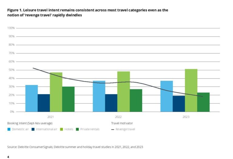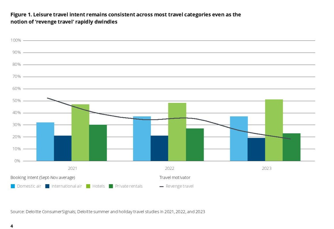 అమెరికన్లు ప్రతీకార ప్రయాణానికి దూరంగా ఉన్నప్పటికీ, ప్రయాణించాలనే కోరిక బలంగా ఉందని నివేదిక పేర్కొంది. మునుపటి సంవత్సరాల కంటే 2023లో వేసవి మరియు సెలవులు రెండింటికీ మరిన్ని ప్రయాణ ప్రణాళికలతో హోటల్లు మరియు దేశీయ విమానాలను బుకింగ్ చేయడంపై ఆసక్తి స్థిరంగా ఉంది. పెండెంట్-అప్ డిమాండ్ క్షీణిస్తున్నప్పుడు, ప్రయాణం చేయాలనే కోరిక మరియు 2024 కోసం దృక్పథం బలంగానే ఉన్నాయి.