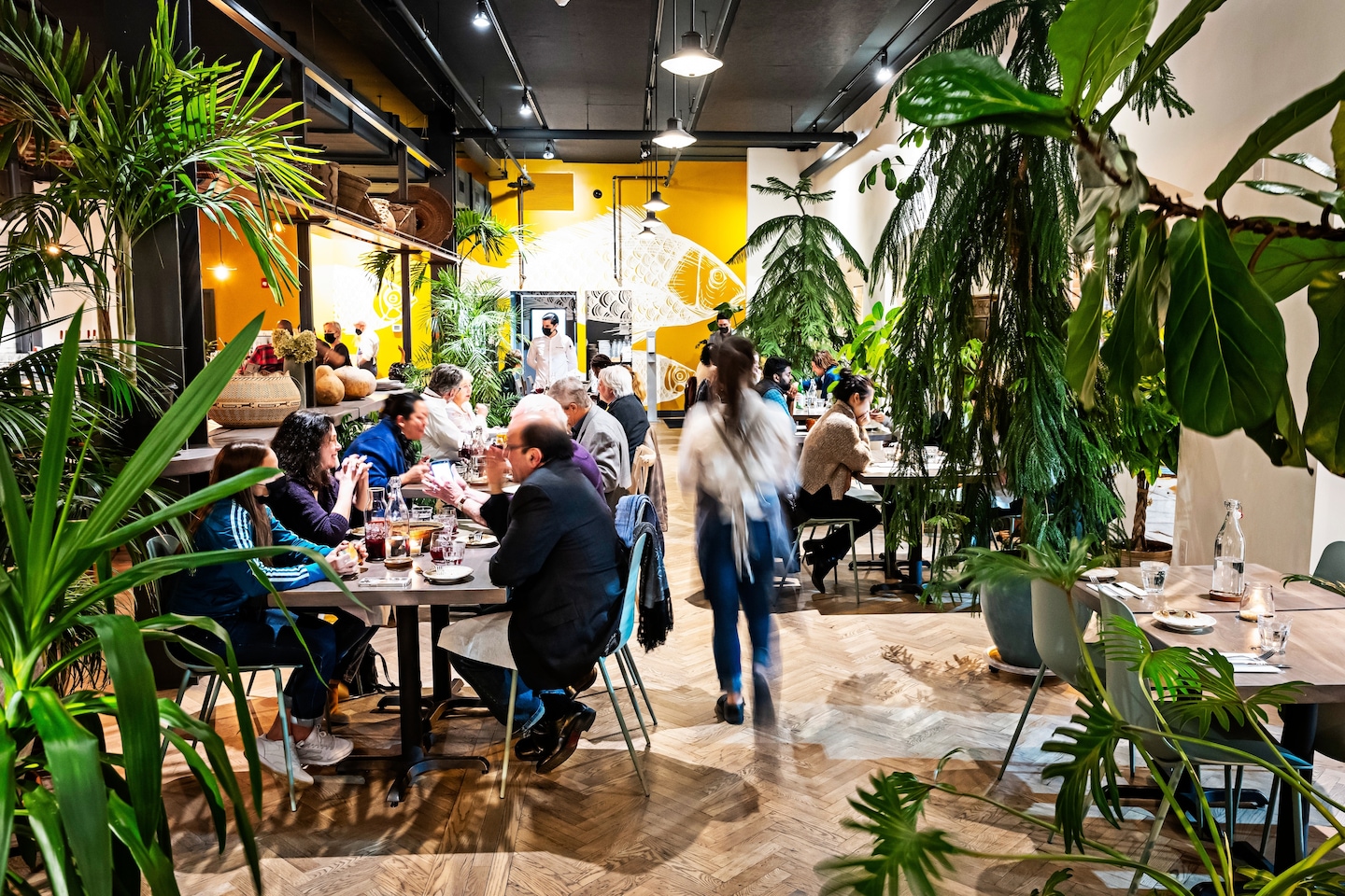 వెనుక బార్‌తో పూర్తి చేసిన భోజనాల గది యజమానులకు ఇష్టమైన రంగులతో నిండి ఉంటుంది: మెను, బూత్‌లు మరియు సీలింగ్ అన్నీ నీలం రంగులో ఉంటాయి. ప్రవేశ ద్వారం నుండి కొంచెం దూరంలో ఉన్న ఒక చిన్న లాంజ్ చేతులకుర్చీలు మరియు వాల్‌పేపర్‌లతో హాయిగా ఉండే సందు, ఇది మీరు అడవిలోకి చూస్తున్న అనుభూతిని కలిగిస్తుంది.