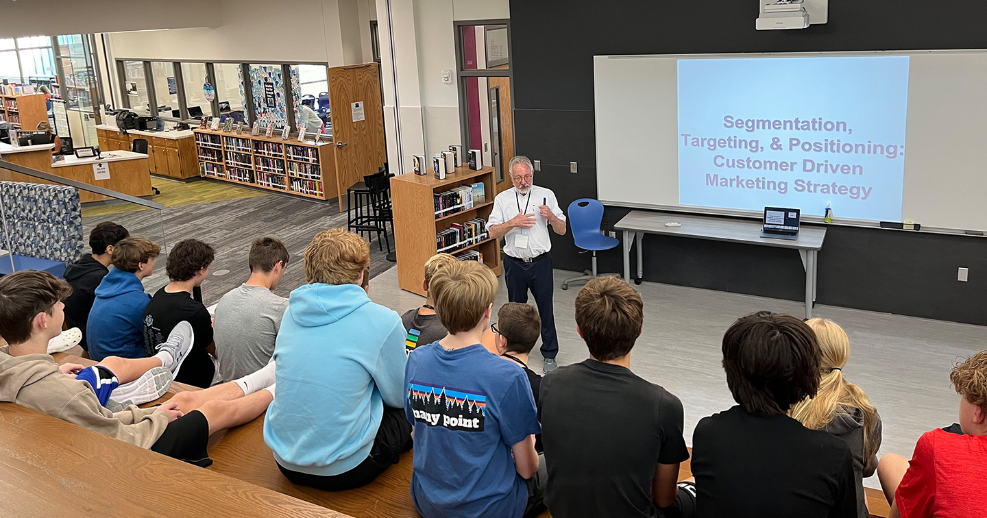 స్కూల్ ఆఫ్ బిజినెస్కు చెందిన స్టాండింగ్ బేర్ ఉపాధ్యాయులు మరియు అధ్యాపకులు సమావేశమయ్యారు మరియు హైస్కూల్లో అందించే ప్రతి కోర్సులో, కళ నుండి గణితానికి సైన్స్ వరకు మరియు వ్యాపారాన్ని మార్కెటింగ్, మేనేజ్మెంట్, అకౌంటింగ్ మరియు మరిన్నింటిలో ఎలా చేర్చవచ్చో చర్చించారు. . మేము వారి ప్రతిభను మరియు ఫీల్డ్లో కెరీర్ అవకాశాలను అన్వేషించడంలో వారికి సహాయం చేసాము. ఫైనాన్స్, సప్లై చైన్ మేనేజ్మెంట్, ఎకనామిక్స్. విశ్వవిద్యాలయ అధ్యాపకులు కూడా హైస్కూల్ వరల్డ్ ఆఫ్ బిజినెస్ క్లాస్లలో అతిథి ఉపన్యాసం చేస్తారు.