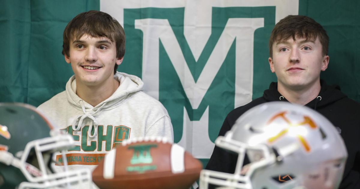 జనవరి 11, 2024 గురువారం బుట్టే సెంట్రల్ హై స్కూల్లో మోంటానా టెక్ ఫుట్బాల్ లెటర్ ఆఫ్ ఇంటెంట్ సంతకం కార్యక్రమంలో జేన్ మూడ్లీ (ఎడమ) మరియు జాక్ మోంటానా టెక్ ఫుట్బాల్ హెడ్ కోచ్ కైల్ శాంసన్ను విన్నారు.・మిస్టర్ కీలీ.