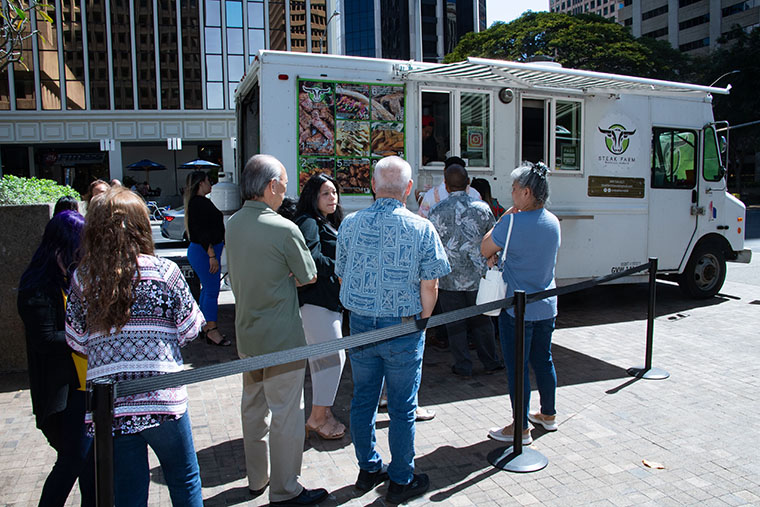 బ్యాంక్ ఆఫ్ హవాయి తన రెండవ “ఫుడ్ ట్రక్ డే”ని గురువారం హోనోలులు డౌన్టౌన్లో నిర్వహించింది, ఇందులో స్థానిక ఫుడ్ ట్రక్కులు మరియు ఫుడ్ స్టాల్స్ ఉన్నాయి. ఈ కార్యక్రమం ప్రతినెలా మూడవ గురువారం నిర్వహించబడుతుంది.