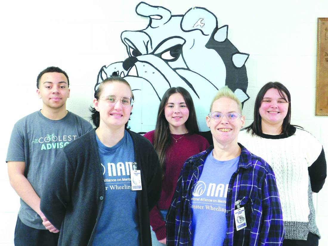 బ్రిడ్జ్పోర్ట్ హైస్కూల్ ఇంటరాక్ట్తో గ్రేటర్ వీలింగ్ వెస్ట్ వర్జీనియాలోని మానసిక వికలాంగుల కోసం అలయన్స్ సభ్యులుగా ఉన్న ఫ్యామిలీ సర్వీసెస్ నావిగేటర్ మేగాన్ ఇలియట్ (ఎడమవైపు ముందు) మరియు పీర్ సర్వీసెస్ నావిగేటర్ కైలా స్ట్రెయిట్ ఫోటో కర్టసీ. క్లబ్ నుండి విరాళాలు స్వీకరించబడ్డాయి మరియు వారు సమర్పించారు సీనియర్ లెఫ్టినెంట్. అధ్యక్షుడు దావోంటే స్మిత్, వెనుక, ఎడమ, జూనియర్ మరియు ప్రెసిడెంట్ తయా కూపర్, మరియు టీచర్ మరియు క్లబ్ సలహాదారు లినెట్ ఎల్మంట్రాట్. ఫిబ్రవరిలో మానసిక ఆరోగ్య దినోత్సవం సందర్భంగా వారు డబ్బును సేకరించారు.