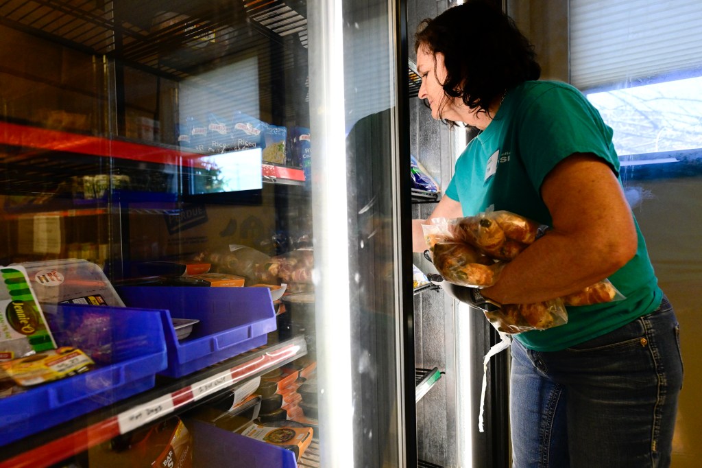 వాలంటీర్ టీనా రీవ్స్ మే 1, 2023 సోమవారం నాడు బ్లూమ్ఫీల్డ్ ఫిష్ ఫుడ్ బ్యాంక్ మరియు ఫ్యామిలీ రిసోర్స్ సెంటర్లోని ఫ్రీజర్లో ఆహార విరాళాలను లోడ్ చేసారు. (మాథ్యూ జోనాస్/స్టాఫ్ ఫోటోగ్రాఫర్)