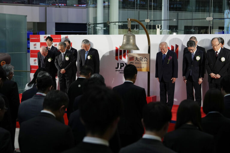 4వ తేదీన టోక్యో స్టాక్ ఎక్స్ఛేంజ్లో జరిగిన కార్యక్రమంలో నూతన సంవత్సరం రోజున మధ్య జపాన్ సముద్ర ప్రాంతంలో సంభవించిన భారీ భూకంపం బాధితుల కోసం ఆర్థిక మంత్రి షునిచి సుజుకీ (కుడి నుండి మూడవది) మరియు ఇతరులు కొద్దిసేపు మౌనం పాటించారు. 2024లో ట్రేడింగ్ మొదటి రోజు జ్ఞాపకార్థం. (క్యోడో న్యూస్)