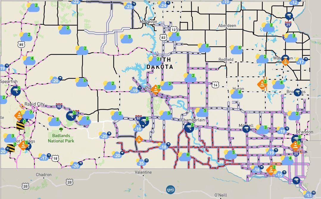 సౌత్ డకోటా 511 వెబ్సైట్ ప్రకారం, ఆగ్నేయ దక్షిణ డకోటా అంతటా ప్రస్తుతం రహదారి పరిస్థితులు అధ్వాన్నంగా ఉన్నాయి, దాదాపు సున్నా దృశ్యమానత, స్నోడ్రిఫ్ట్లు మరియు జారే మచ్చలు ఉన్నాయి.