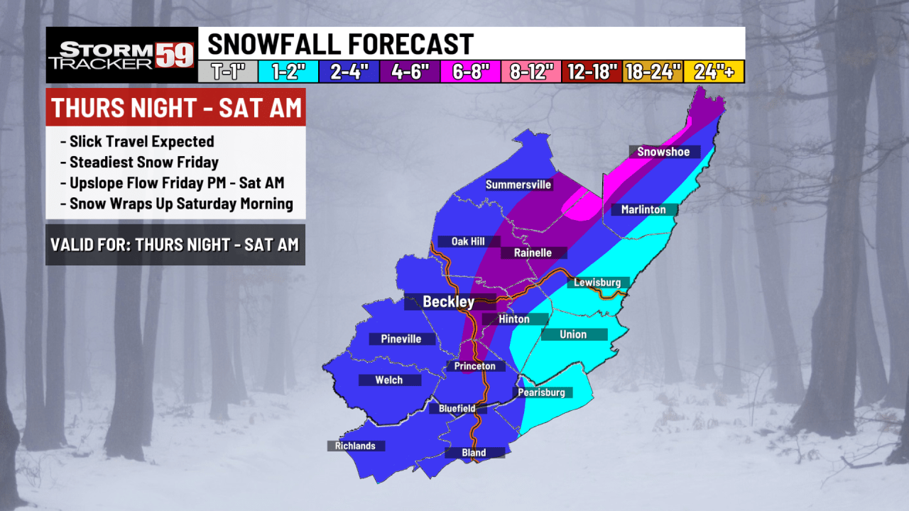 గురువారం రాత్రి నుండి శనివారం ఉదయం వరకు, మా ప్రాంతంలో చాలా వరకు 2 నుండి 4 అంగుళాల తాజా మంచు కనిపిస్తుంది, గ్రీన్బ్రియర్ వ్యాలీలో తక్కువగా ఉంటుంది మరియు పర్వతాలలో అర అడుగు ఉంటుంది. ఇది ఈ వారంలో ఇప్పటికే పడిపోయిన మొత్తం పైన అని గుర్తుంచుకోండి. అధిక ఉష్ణోగ్రతలు రోజంతా 20లలోనే ఉంటాయి, గాలి గాలులు 30 mph వరకు ఉండవచ్చు మరియు గాలి చలి సూచికలు 10s నుండి సింగిల్ డిజిట్కు పడిపోతాయి.