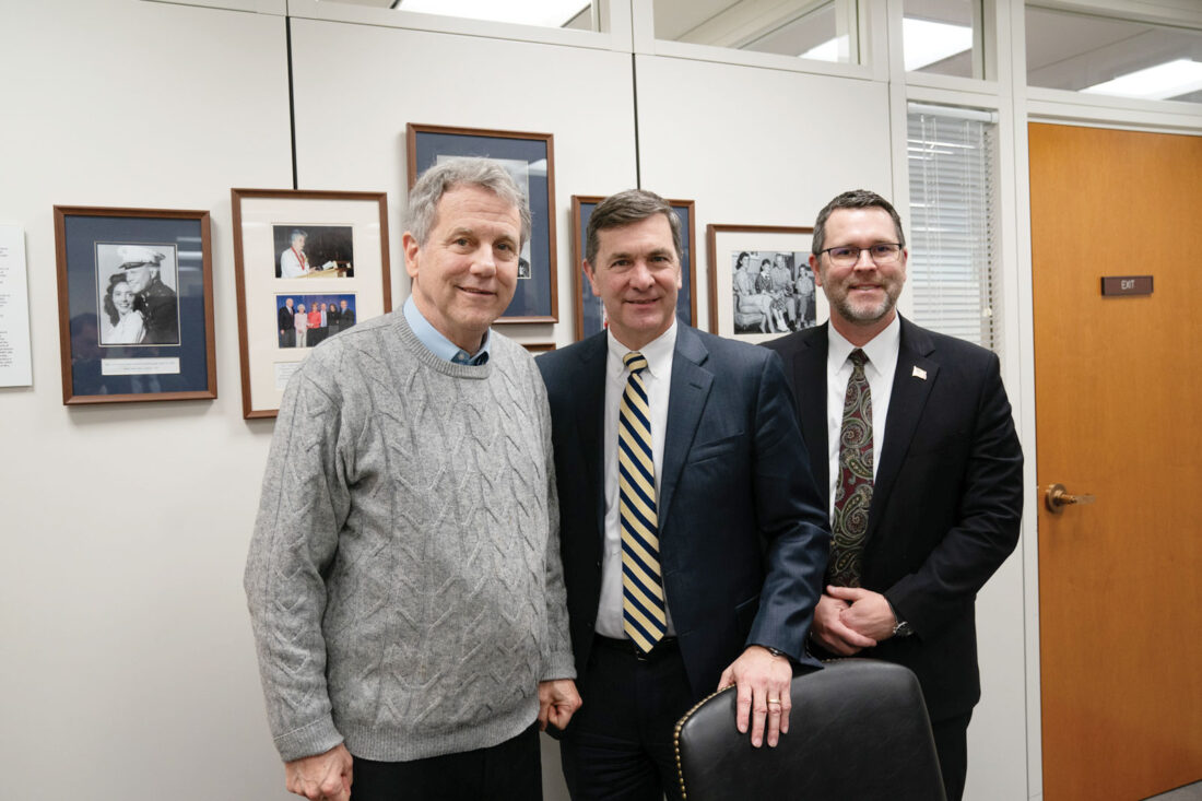 ఎడమ నుండి: సేన్. షెర్రోడ్ బ్రౌన్, D-Ohio; స్కాట్ కాంట్లీ, మెమోరియల్ హెల్త్ సిస్టమ్ ప్రెసిడెంట్ మరియు CEO; మరియు ఫిజిషియన్ సర్వీసెస్ వైస్ ప్రెసిడెంట్ మరియు చీఫ్ మెడికల్ ఆఫీసర్, మెమోరియల్ హెల్త్ సిస్టమ్. డాన్ బ్రీస్, ఒక ఫోటోగ్రాఫర్, ఫోటోకి పోజులిచ్చాడు. మిస్టర్ బ్రౌన్ 2020-2021లో కరోనావైరస్ సంబంధిత ఖర్చుల కోసం ఫెడరల్ ఎమర్జెన్సీ మేనేజ్‌మెంట్ ఏజెన్సీ నుండి మెమోరియల్ హెల్త్ సిస్టమ్ కోసం $20 మిలియన్లకు పైగా సహాయం అందించారు. (ఫోటో అందించబడింది)